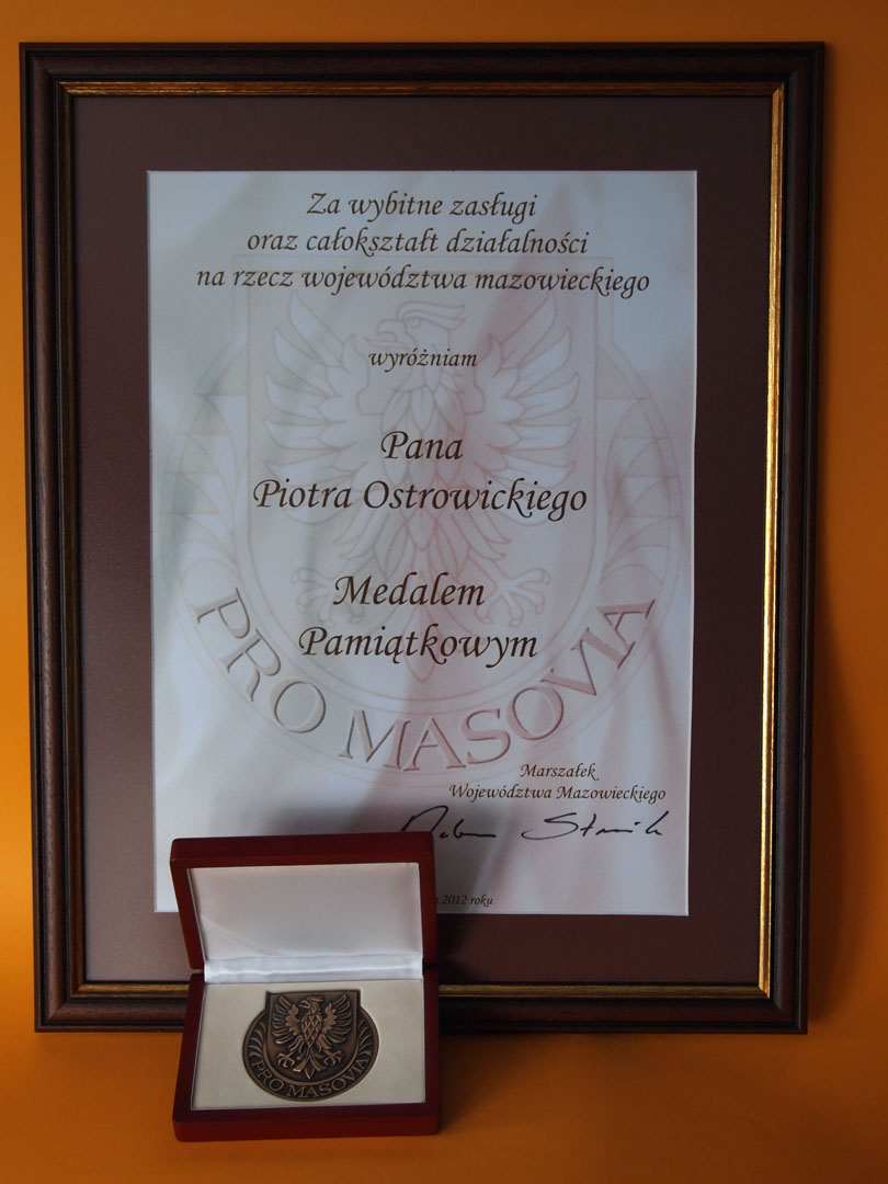 Otrzymany przez Prezesa Medal Pamiątkowy „Pro Masovia” jest wyróżnieniem okolicznościowym, nadawanym osobom fizycznym, jednostkom samorządu terytorialnego, organizacjom pozarządowym, instytucjom państwowym oraz innym osobom prawnym i jednostkom organizacyjnym nie mającym osobowości prawnej, które całokształtem działalności zawodowej, społecznej, publicznej lub realizacją swoich zadań na rzecz Województwa Mazowieckiego wybitnie przyczyniły się do gospodarczego, kulturalnego lub społecznego rozwoju Mazowsza. Medal Pamiątkowy „Pro Masovia” został ustanowiony Uchwałą Nr 142/06 Sejmiku Województwa Mazowieckiego z dnia 10 lipca 2006r. Kandydaturę Dyrektora do nagrody zgłosiła Wojewódzka Społeczna Rada ds. Osób Niepełnosprawnych. Piotr Ostrowicki posiada duże zasługi na polu integracji osób niepełnosprawnych ze społecznością lokalną i ponadlokalną. Nawiązał szerokie kontakty ze społecznością lokalną, z wieloma instytucjami i organizacjami, dzięki czemu mieszkańcy województwa mazowieckiego bardzo aktywnie uczestniczą w życiu kulturalnym, artystycznym i społecznym. Z jego inicjatywy było organizowanych wiele imprez integracyjnych dla osób niepełnosprawnych. Wśród tych imprez należy wymienić przede wszystkim corocznie organizowany „Dzień Przyjaznych Serc”, w którym biorą udział poza mieszkańcami DPS-u w Płocku również podopieczni innych instytucji z terenu województwa mazowieckiego.