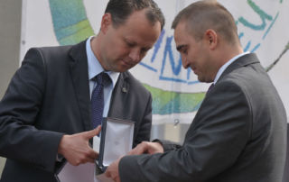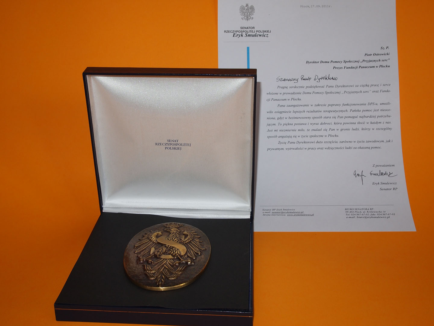 Medal Senatu Rzeczypospolitej Polskiej dla Piotra Ostrowickiego wręczył Senator RP – Pan Eryk Smulewicz, w obecności Poseł na Sejm RP – Pani Julii Pitery oraz Prezydenta Miasta Płocka – Pana Andrzeja Nowakowskiego podczas organizowanej przez Dom Pomocy Społecznej „Przyjaznych serc” i Fundację Panaceum imprezy integracyjnej „Dzień Przyjaznych Serc”. W swoim wystąpieniu Pan Senator zwrócił uwagę na wkład Piotra Ostrowickiego w rozwój Domu Pomocy Społecznej „Przyjaznych Serc” w Płocku oraz Fundacji Panaceum. Podczas uroczystego wręczania medalu Pan Senator zaznaczył, iż zaangażowanie Pana Piotra Ostrowickiego w zakresie poprawy funkcjonowania DPS – umożliwiło osiągnięcie lepszych rezultatów terapeutycznych, a pomoc Prezesa jest nieoceniona, gdyż w bezinteresowny sposób stara się pomagać najbardziej potrzebującym. Pan Senator docenił także determinację i ogromne zaangażowanie Piotra Ostrowickiego na polu integracji osób niepełnosprawnych ze społecznością lokalną, czego przykładem jest wiele imprez integracyjnych organizowanych dla osób niepełnosprawnych, w których biorą udział poza mieszkańcami DPS-u w Płocku również podopieczni innych instytucji z terenu województwa mazowieckiego. Jak mówił Pan Eryk Smulewicz: „to piękna postawa i wyraz dobroci, która powinna tkwić w każdym z nas”. Kończąc swoje wystąpienie Senator Rzeczypospolitej Polskiej – Pan Eryk Smulewicz przekazał Piotrowi Ostrowickiemu list gratulacyjny.