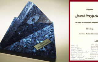 W dniu 2 grudnia 2012 roku Prezes Zarządu Fundacji Panaceum – Piotr Ostrowicki otrzymał statuetkę „Jesteś Przyjacielem” za działania działają na rzecz osób niepełnosprawnych bez formalnego obowiązku, lecz z potrzeby serca i chęci budowania standardów ułatwiających osobom niepełnosprawnym funkcjonowanie w życiu społecznym.