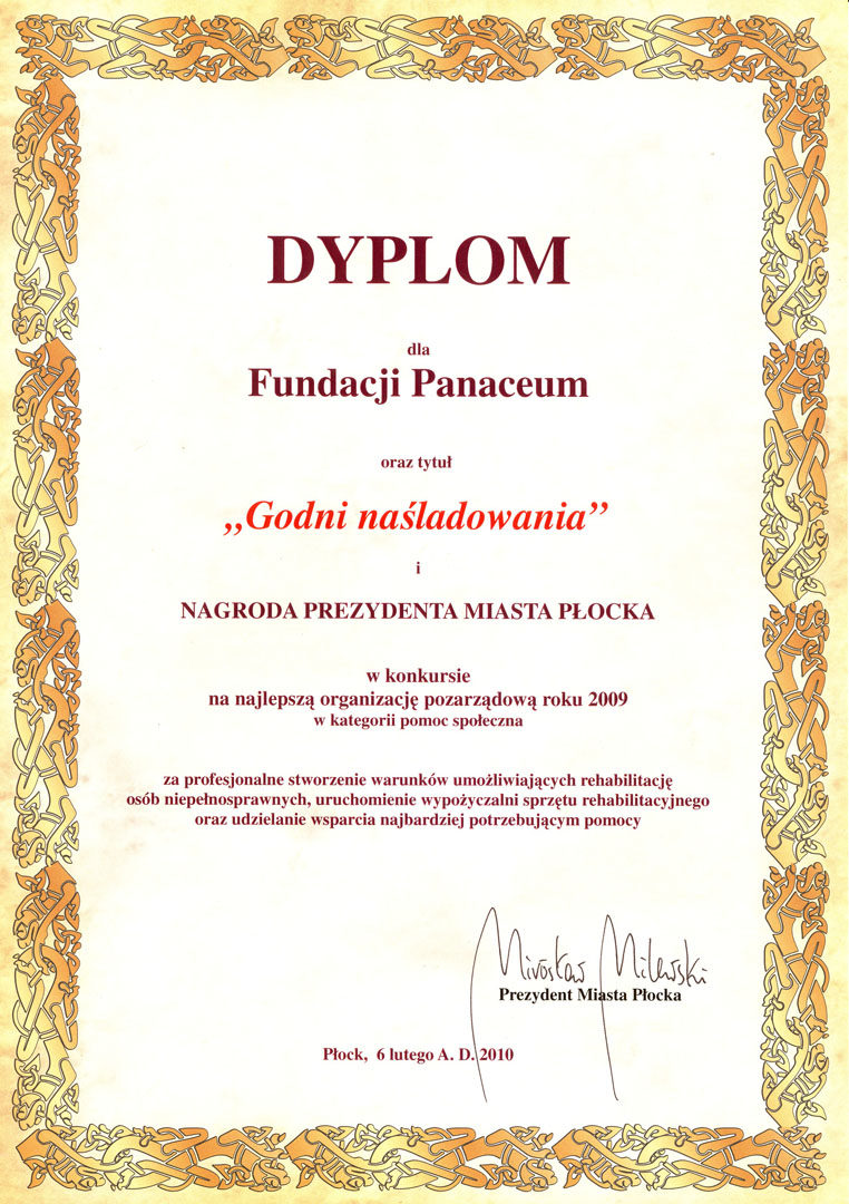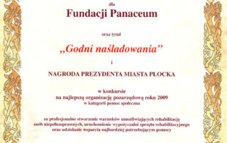 Ogłoszenie wyników oraz wręczenie nagród laureatom Konkursu „Godni Naśladowania” odbyło się w płockim Amfiteatrze podczas Dni Historii Płocka. Nagrody laureatom konkursu wręczał Prezydent Miasta Płocka – Andrzej Nowakowski. Tytuł „Godni Naśladowania” to dla Fundacji Panaceum nie tylko szczególne wyróżnienie , ale jednocześnie znakomita motywacja do dalszej, jeszcze lepszej pracy na rzecz niepełnosprawnych mieszkańców naszego miasta.