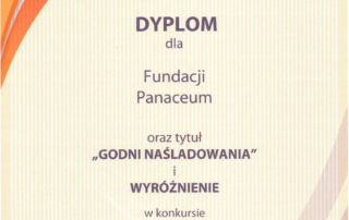 Fundacja Panaceum była jedną z 27 organizacji pozarządowych zgłoszonych w III edycji konkursu na najlepszą organizację pozarządową w roku 2009 i zdobyła I miejsce w kategorii „pomoc społeczna”, zyskując tytuł „Godni Naśladowania” za profesjonalne stworzenie warunków umożliwiających rehabilitację osób niepełnosprawnych, uruchomienie wypożyczalni sprzętu rehabilitacyjnego oraz udzielanie wsparcia najbardziej potrzebującym pomocy. Za zwycięstwo w konkursie otrzymaliśmy nagrodę w postaci laptopa oraz dyplom.