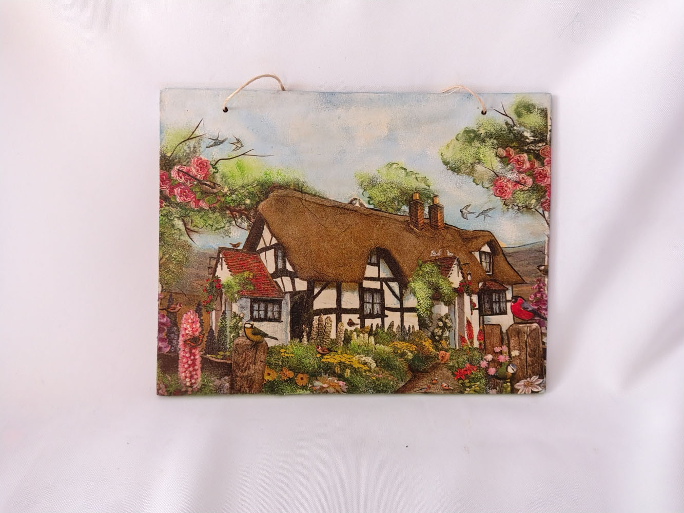Sielankowa kompozycja wykonana techniką decupage na desce.