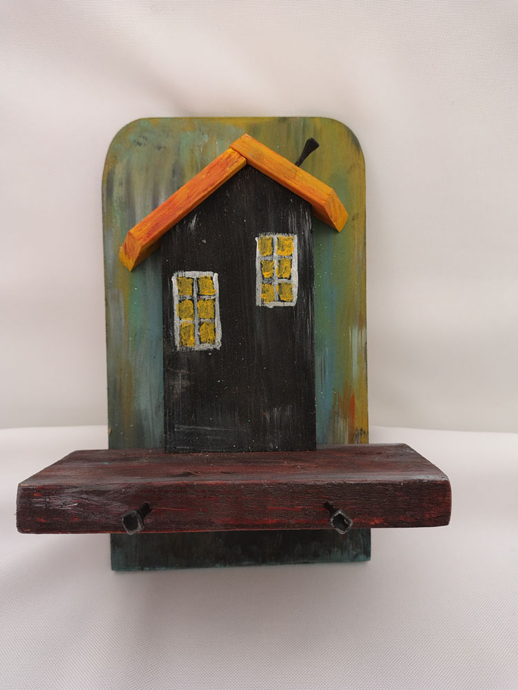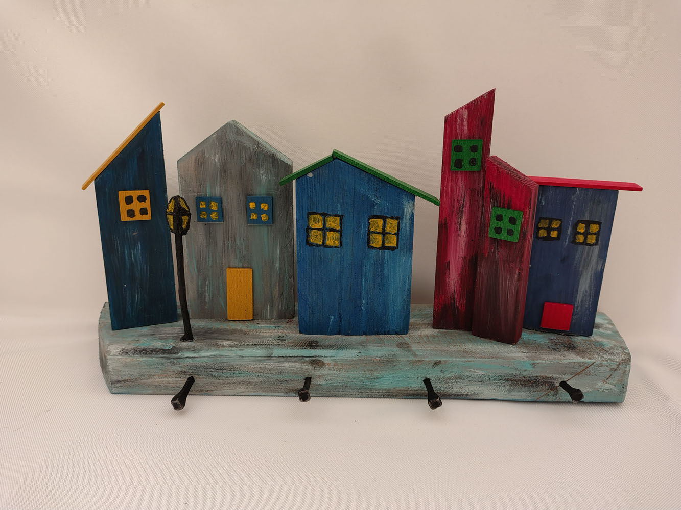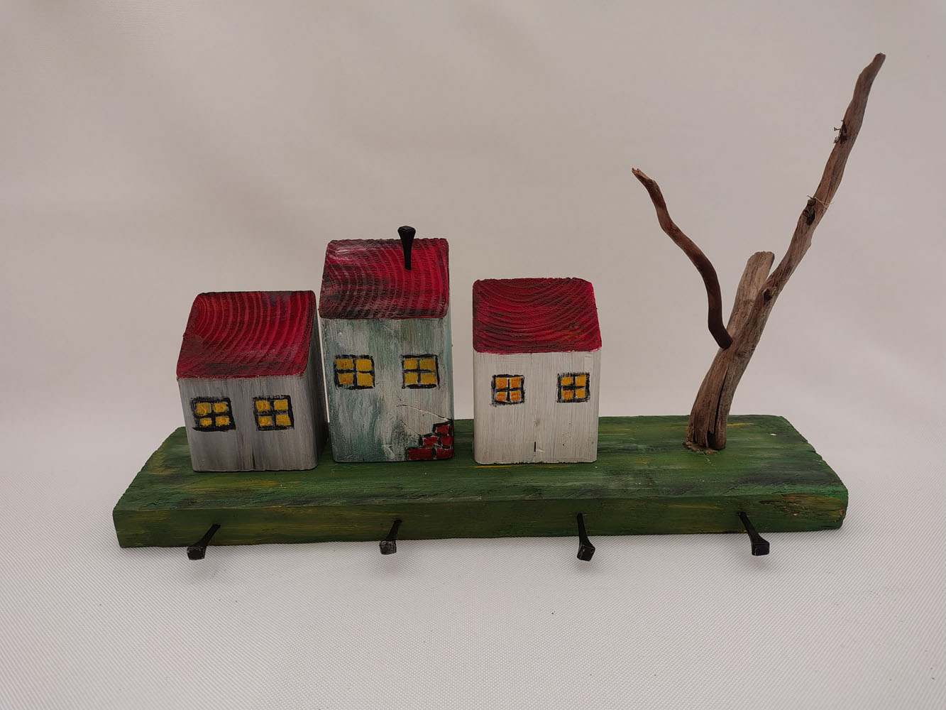 Solidne wieszaki wykonane z drewna, przedstawiające piękne domki. Ręcznie malowane. Jako wieszaki wykorzystane kute gwoździe i haki kowalskie. Dostępne w rożnych aranżacjach.